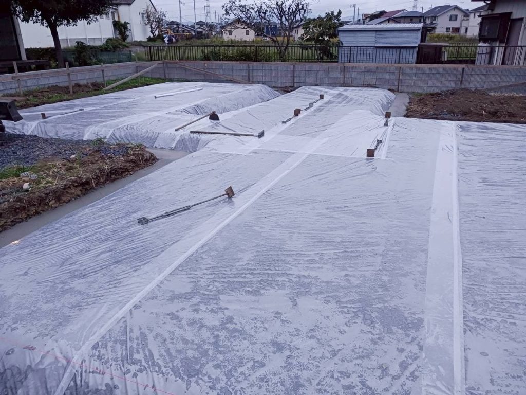 地面からの湿気を防ぐために、防湿シートを前面に敷く工程です。
