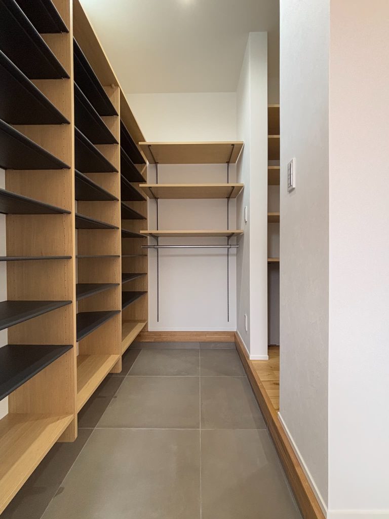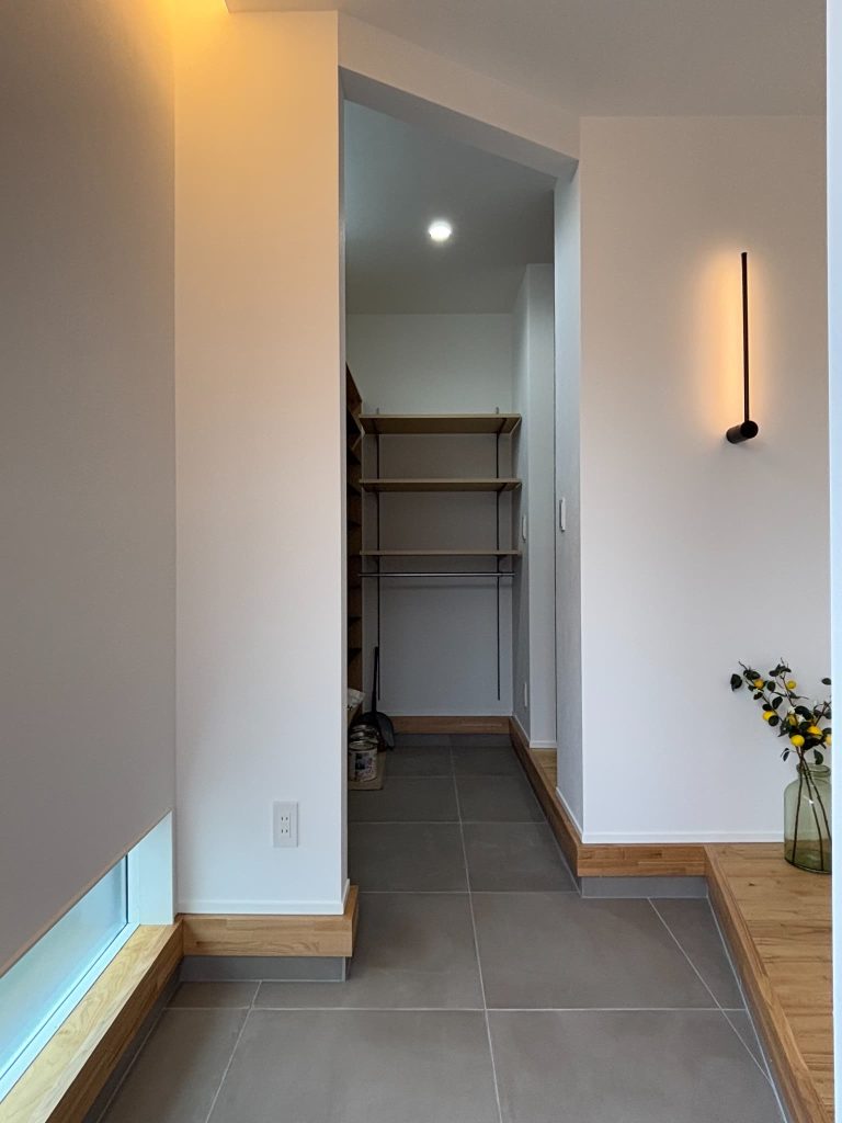 玄関奥には、タイルと木の質感が心地よく整うシューズクローク👟