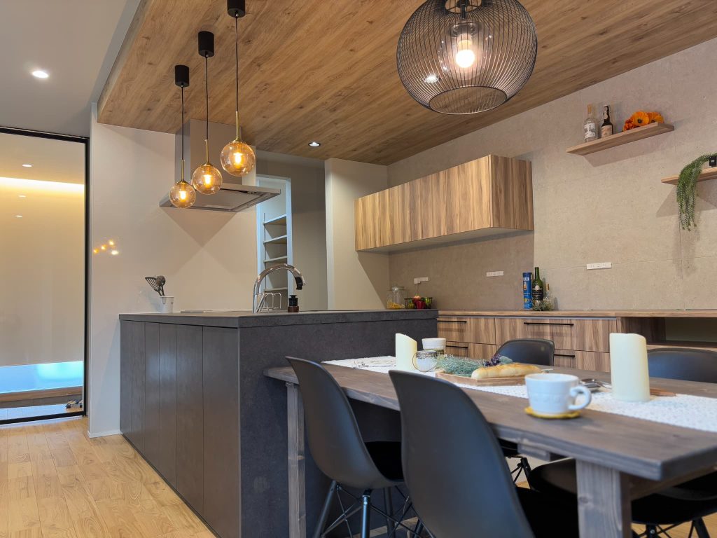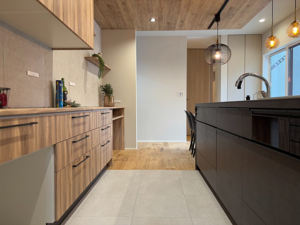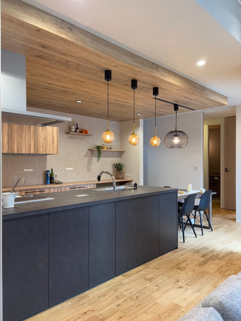 木目の連なりに、黒のアイランドが凛と映えるキッチン。