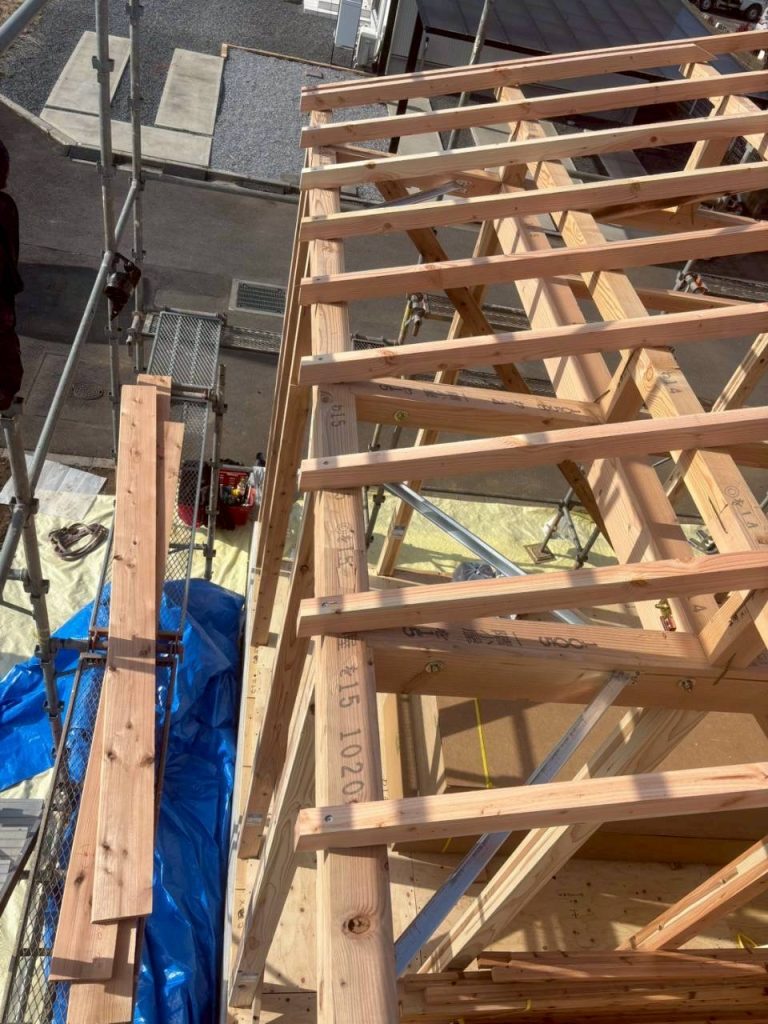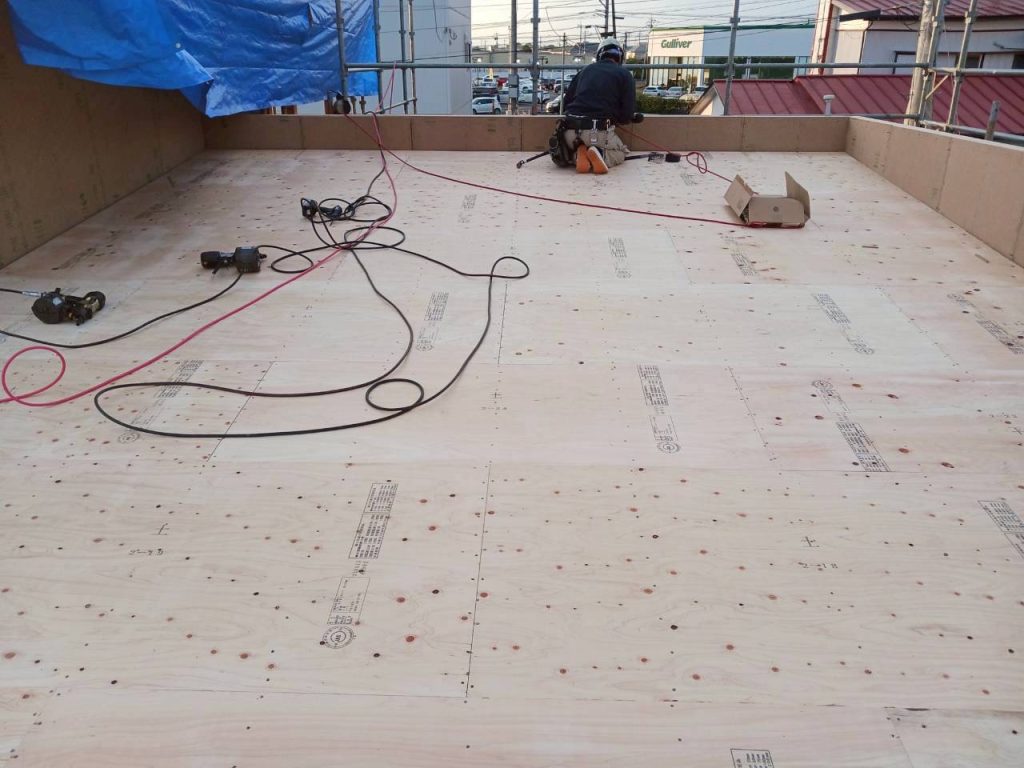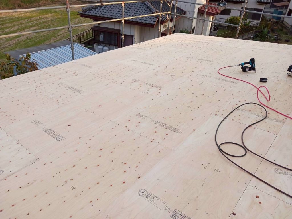 この板を張ることで屋根の強度が増し、家全体の耐久性を支える、重要な工程となっています!