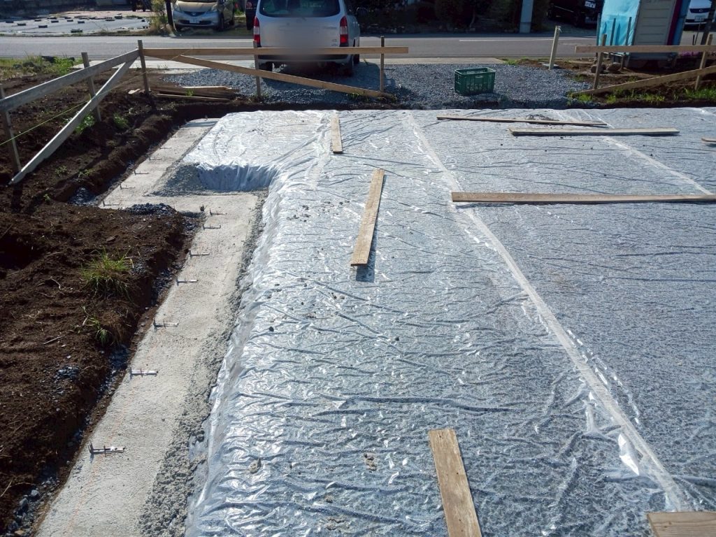 地面からの湿気防止の為に、防湿シートを敷いていき、