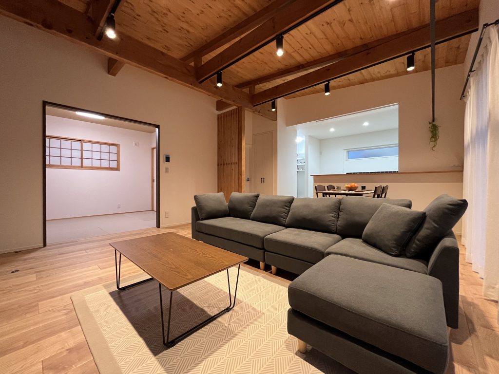 example施工実例 レトロな家 ジャパニーズ ーどこか懐かしい、温もりのある平屋ー どこか懐かしさを感じる色合いや雰囲気の室内勾配天井で開放感抜群のLDKは、梁と羽目板で温もりを感じる空間 DATA ■ 敷地面積:241.22坪■ 延床面積:30.00坪■ 施工地域:栃木県栃木市■ 間取り:3LDK