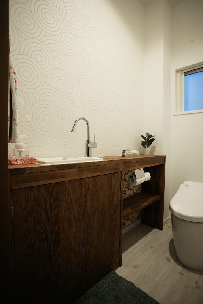 外観はシンプルな塗り壁、内観は深みのあるお色味の床材やタイルを