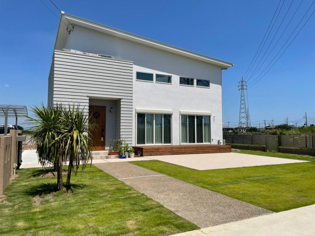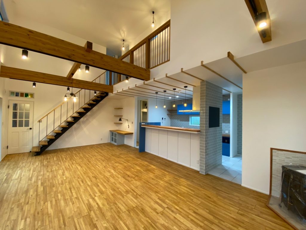 example施工実例 家を巧む サーフ・アメリカン ー熟思にて実現する理想の住まいー ラップサイディングと塗り壁の外観に、ブルーの差し色がアクセントの内観吹抜け30帖、圧巻のLDKがある大空間の家 DATA ■ 敷地面積:412.39坪■ 延床面積:40.62坪■ 施工地域:茨城県下妻市■ 間取り:4LDK