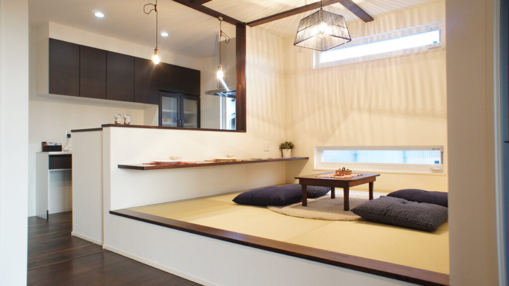 example施工実例 木を感じる平屋住宅 ジャパニーズ 平屋 ークールな外観に反して、中に広がる別世界♪ー 室内はホワイトとブラウンで統一されていて落ち着いた雰囲気のお家。リビング奥には小上がりの畳があり、落ち着く空間に。お施主様ご自身で施工に参加いただき、想いの詰まったお家に仕上がりました。 DATA ■ 敷地面積:―■ 延床面積:―■ 施工地域:―■ 間取り:―
