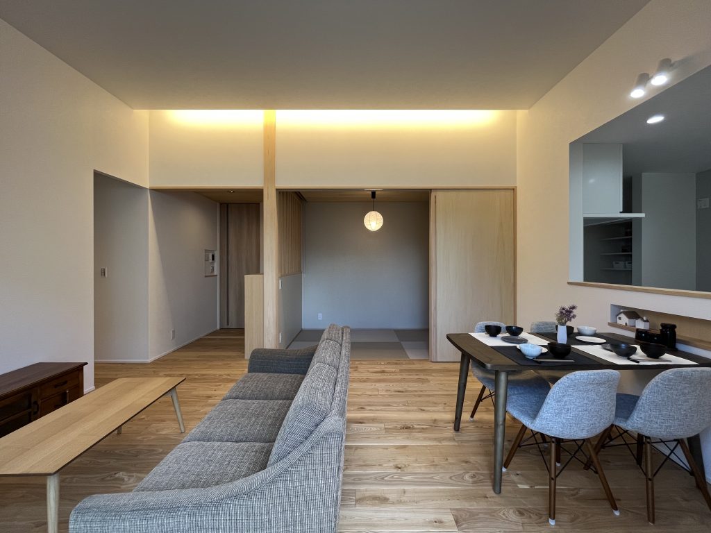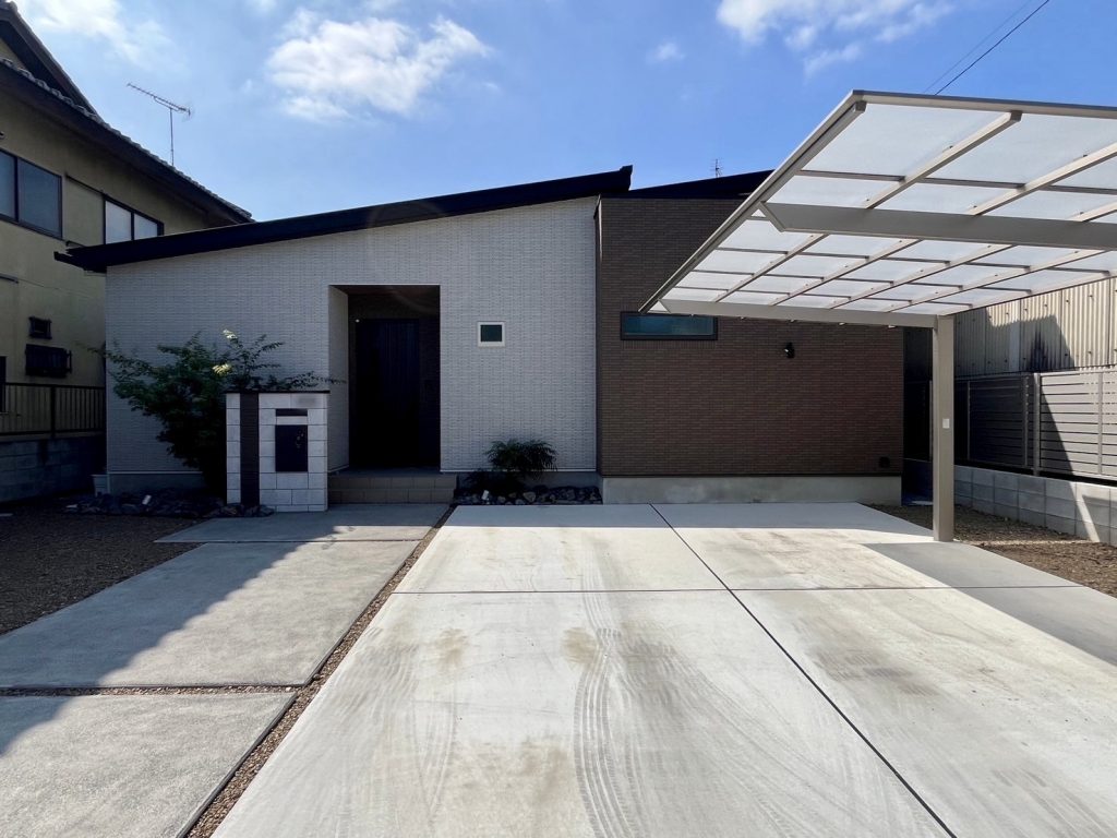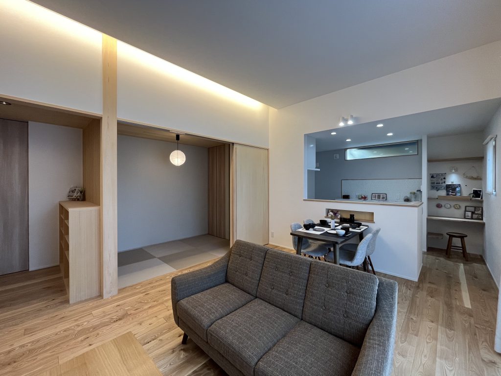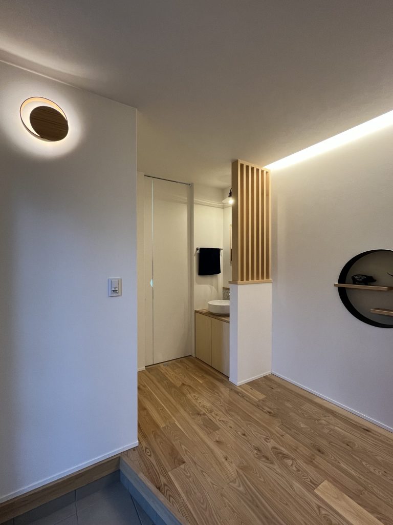 example施工実例 輪の家 ジャパンディ 平屋 ー丸ニッチのあるナチュラル和モダンな平屋ー 和の柔らかさを織り交ぜた平屋高級感漂う総タイル貼りの外壁、間接照明をふんだんに使用した柔らかい光の演出 DATA ■ 敷地面積:93.69坪■ 延床面積:29.99坪■ 施工地域:茨城県結城市■ 家族構成:―