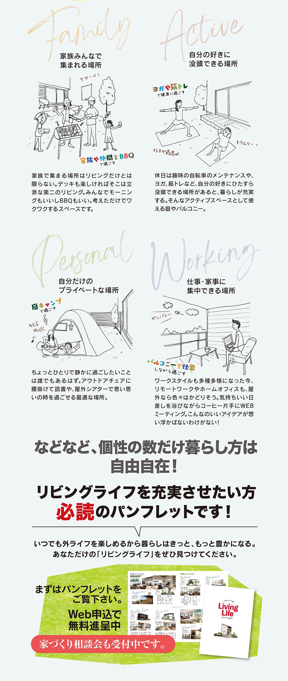暮らし方の可能性が広がる家【リビングライフ】が誕生。自分らしい家づくりをお考えの方にパンフレットを差し上げます。まずはお気軽にお問い合わせ下さい。